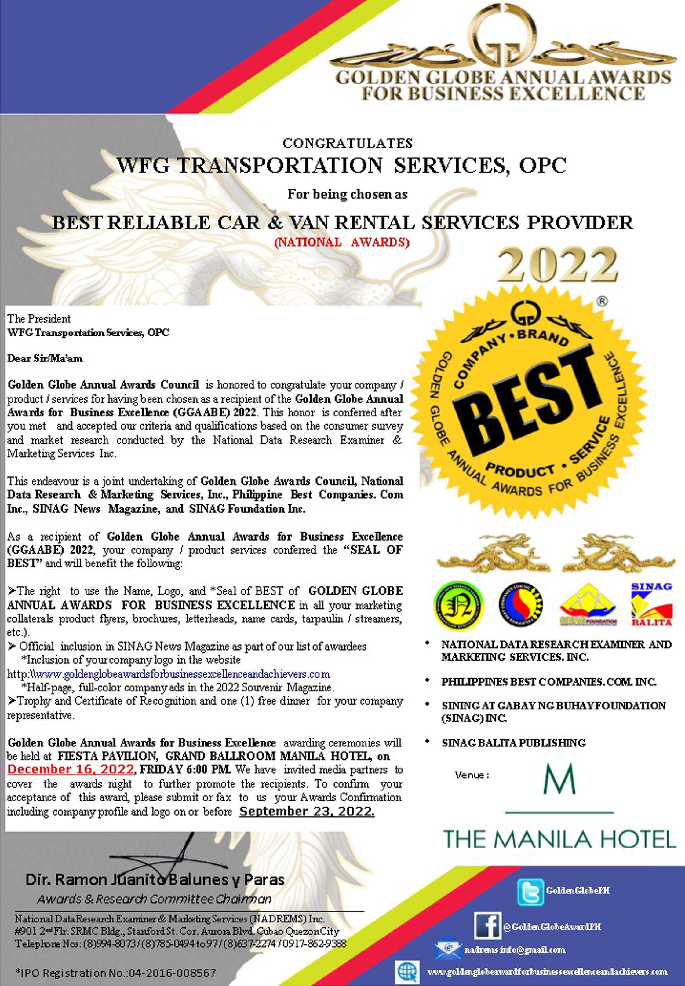 Do you need to hire or rent a chauffeur-driven-car for Metro Manila and even in outside Metro Manila? WFG Transportation can offer you a safe and convenient transport service tailored to your personal and family needs. BOOK NOW